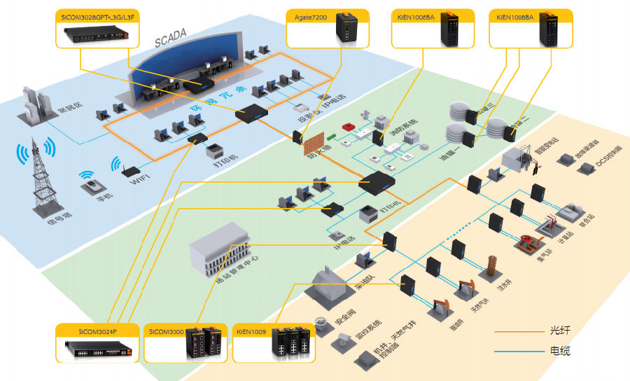 智 能化的數(shù)字油氣田建設(shè)需要構(gòu)建一個安全、高效、可靠的自動化網(wǎng)絡(luò),以提高油田生產(chǎn)、強(qiáng)化生產(chǎn)過程控制、輔助生產(chǎn)管理等。通過有線光纖傳輸網(wǎng)絡(luò)和無線傳輸網(wǎng) 絡(luò),實現(xiàn)油氣田井區(qū)、計量間、集輸站、聯(lián)合站、處理廠之間的生產(chǎn)數(shù)據(jù)、設(shè)備狀態(tài)信息實時傳輸、共享。并可在作業(yè)區(qū)生產(chǎn)指揮中心及生產(chǎn)控制中心進(jìn)行集中管理 和控制。由于網(wǎng)絡(luò)系統(tǒng)承載了視頻監(jiān)控、采集數(shù)據(jù)和控制數(shù)據(jù),因此,一個高帶寬,具有優(yōu)良的冗余性、安全性、實時性和可靠性的骨干網(wǎng)絡(luò)成為油田自動化的主要 需求。
