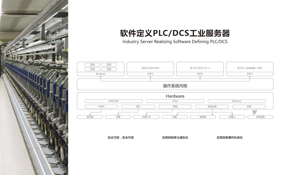 工業(yè)服務(wù)器采用了自主可控的現(xiàn)場高實時操作系統(tǒng)內(nèi)核和創(chuàng)新的現(xiàn)場寬帶工業(yè)總線芯片,以互聯(lián)互通和IPV6技術(shù)實現(xiàn)一網(wǎng)到底,將狀態(tài)感知、傳感器采集、現(xiàn)場控制與工業(yè)網(wǎng)絡(luò)一體化融合,通過將PLC/DCS等傳統(tǒng)控制系統(tǒng)軟化實現(xiàn)對工業(yè)流程的軟件定義。將極大的精簡傳統(tǒng)的控制網(wǎng)絡(luò)結(jié)構(gòu),降低工業(yè)現(xiàn)場系統(tǒng)的總成本,提高工業(yè)現(xiàn)場的部署效率。