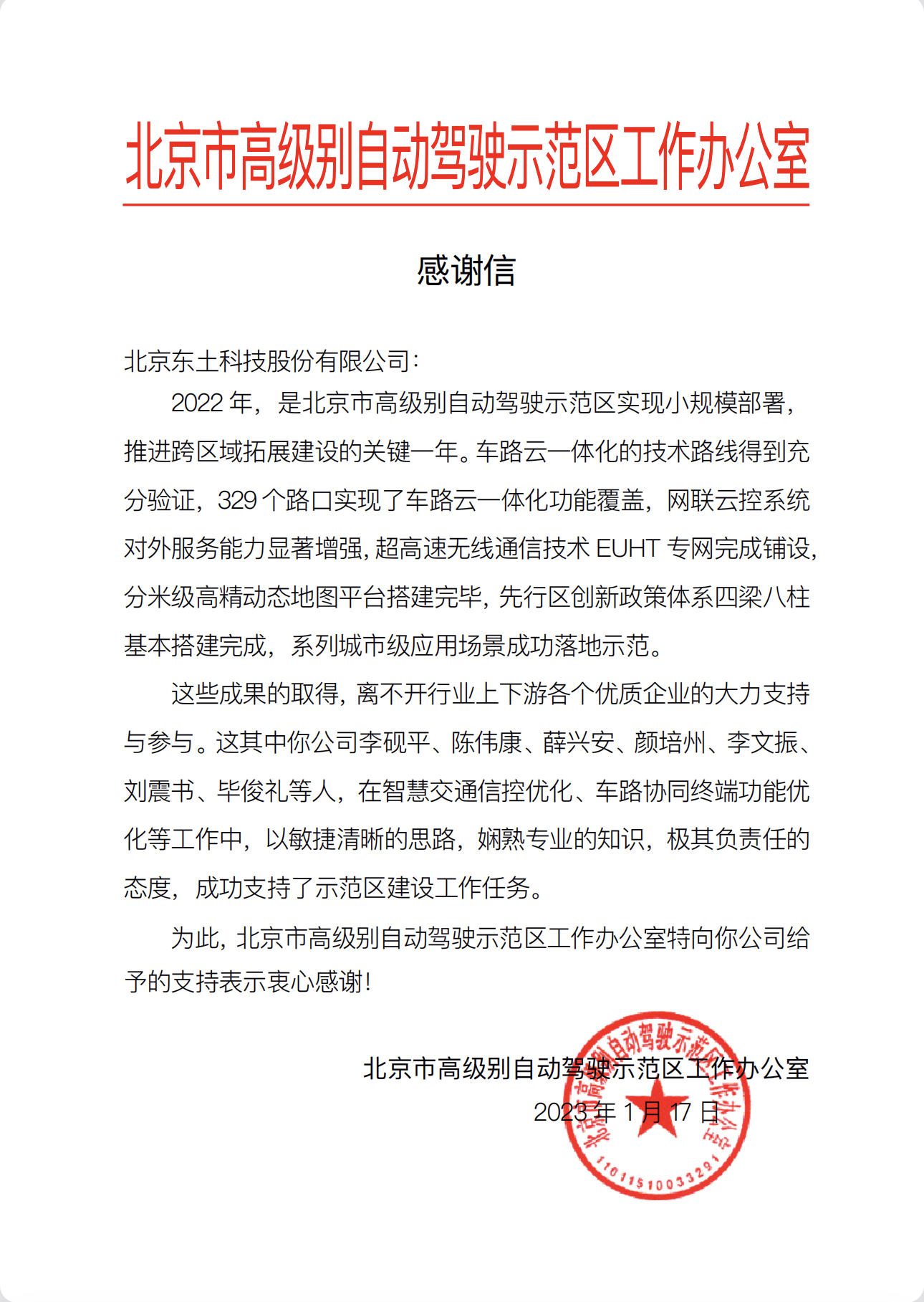 新春佳節(jié)之際,東土科技收到了一份特別的“過節(jié)禮”:公司獲得北京市高級(jí)別自動(dòng)駕駛示范區(qū)工作辦公室的感謝信。這既是對(duì)公司智能交通產(chǎn)品及解決方案的肯定,也代表著對(duì)公司技術(shù)實(shí)力和服務(wù)態(tài)度的褒獎(jiǎng)和認(rèn)可。