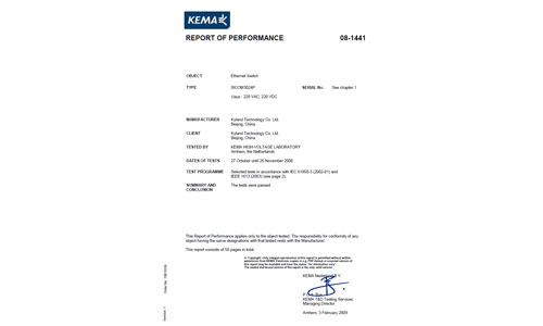 東土自主研發(fā)的SICOM3024P系列工業(yè)以太網(wǎng)交換機在荷蘭KEMA 公司本部順利通過了基于 IEC 61850和 IEEE 1613標(biāo)準(zhǔn)所進行的各項檢測和認(rèn)證。2009年3月27日,東土科技收到了KEMA公司發(fā)來的書面報告,東土成為國內(nèi)首個通過KEMA認(rèn)證的工業(yè)以太網(wǎng)交換機生產(chǎn)廠家。