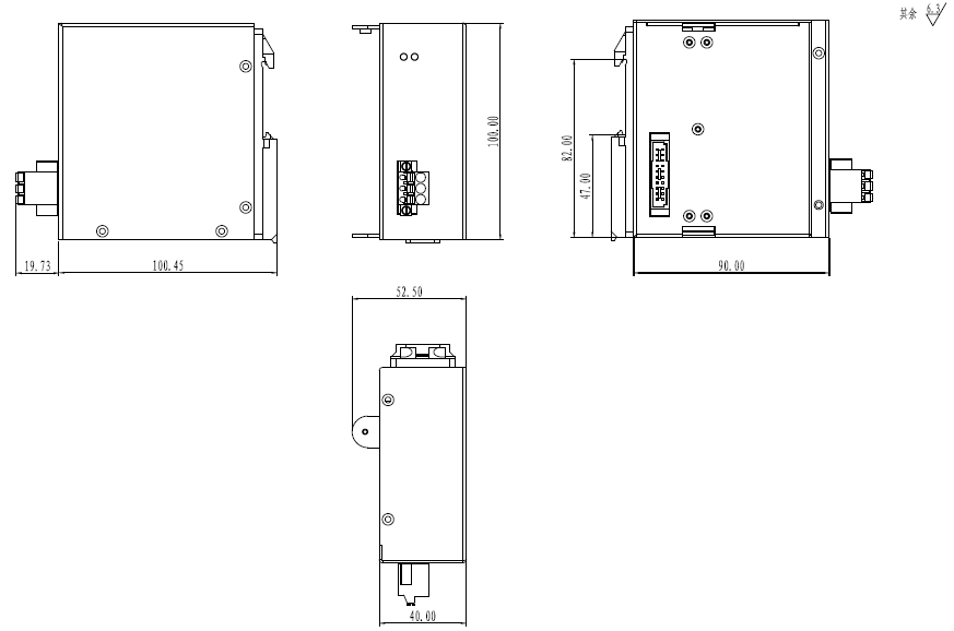 | 機械結構 | 機械結構 鋁質外殼 防護等級 IP30 尺寸 40mm x 100mm x 90mm (W x H x D) 整機重量 470g 安裝方式 導軌安裝 |