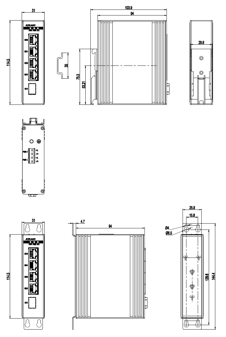 | 機械結(jié)構(gòu) | 外殼 金屬材質(zhì) 散熱方式 自然冷卻,無風(fēng)扇 防護(hù)等級 IP40 尺寸 31mm×114.5mm×94mm (W×H×D) 重量 0.3Kg 安裝方式 DIN卡軌式或壁掛式 |