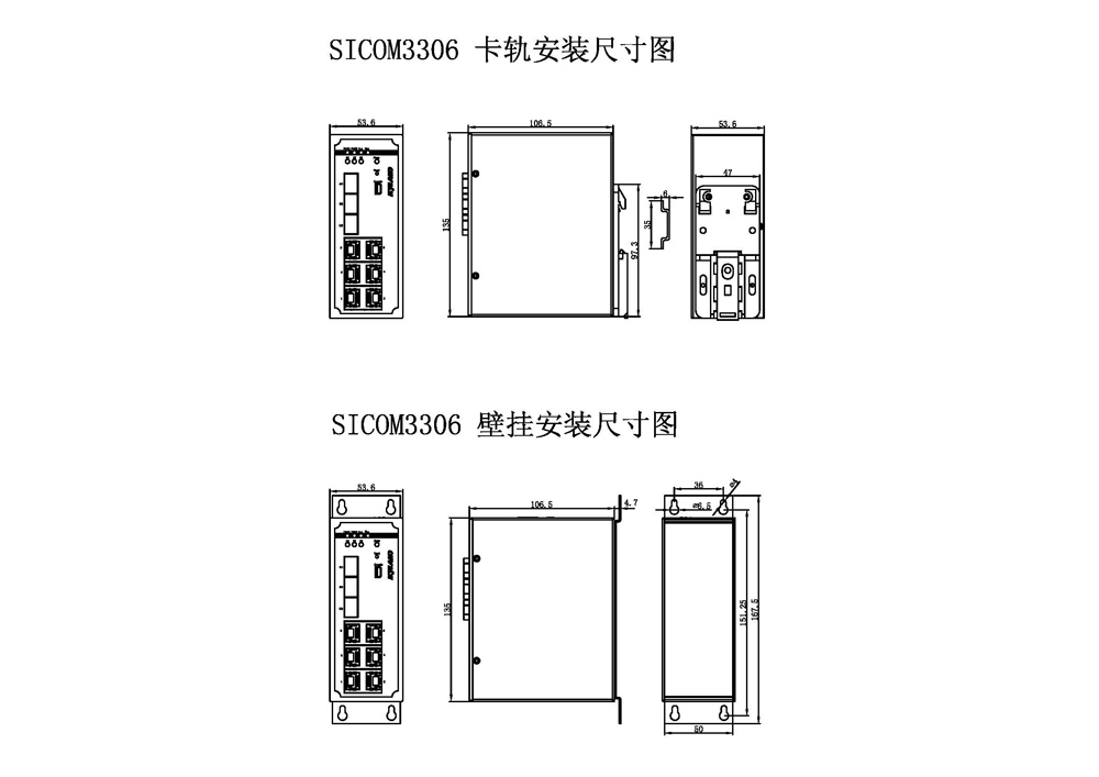 | 機械結構 | 外殼 金屬材質 散熱方式 自然冷卻,無風扇 防護等級 IP40 尺寸 53.6mm×135mm×106.5mm(W×H×D) 重量 0.76Kg 安裝方式 DIN卡軌式或壁掛式 |